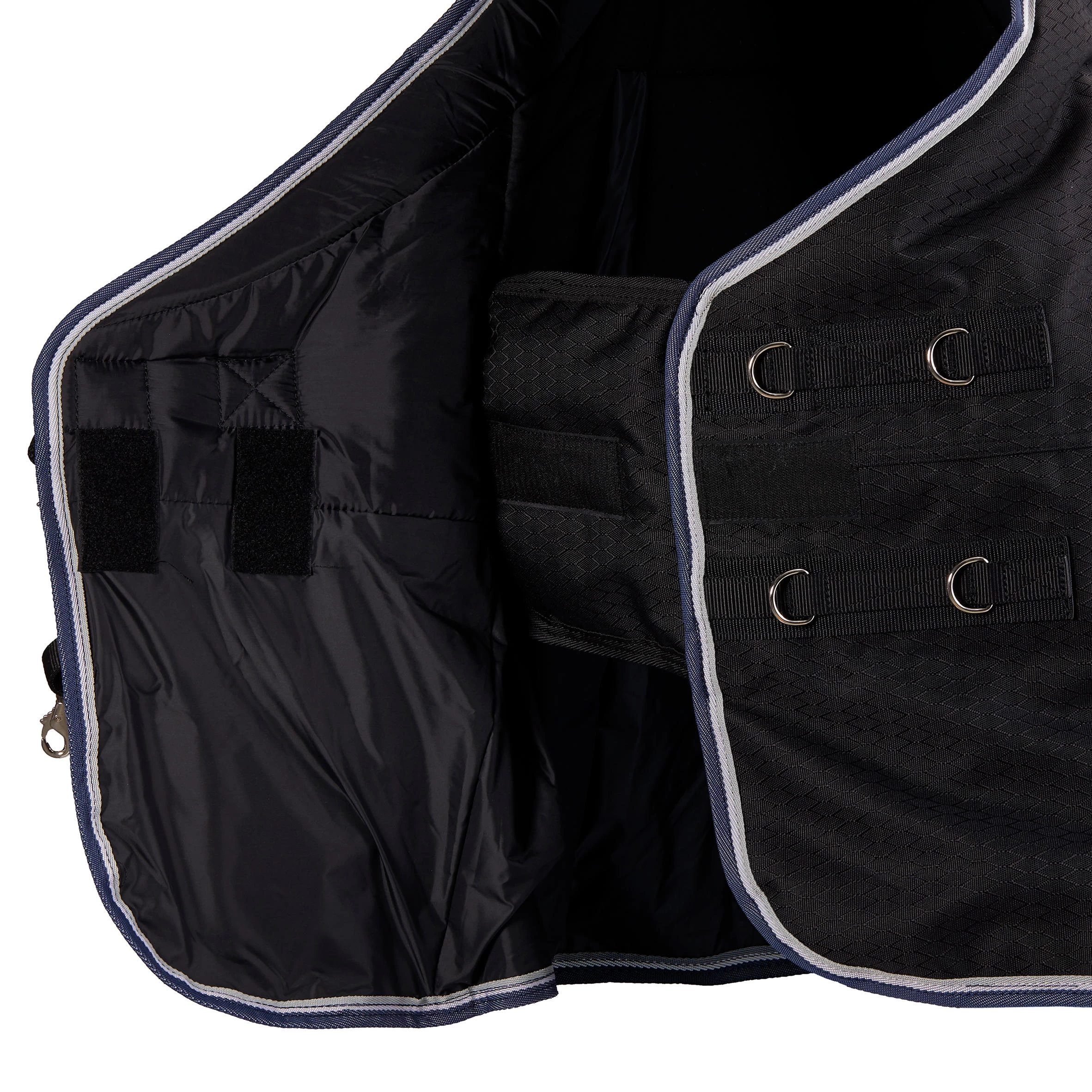 Other fastenings: adjustable cross surcingles. The hook-and-eye fastenings on the cross surcingles are equipped with rubber rein stops that prevent them from coming undone unexpectedly.